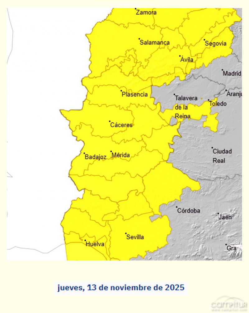 El Centro de Emergencias 112 Extremadura ha activado para este jueves, 13 de noviembre de 2025, la alerta amarilla ante la previsión de lluvias y viento que afectarán a distintas zonas de la Comunidad Autónoma.