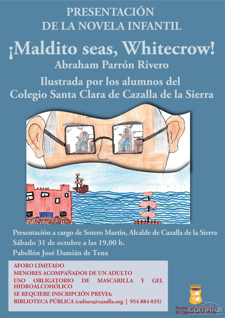 19:00 h.- Presentación de la novela infantil “¡Maldito seas, Whitecrow!”, de Abraham Parrón Rivero. Ilustrada por los alumnos del Colegio Santa Clara de Cazalla de la Sierra. Lugar: Pabellón José Damián de Tena.