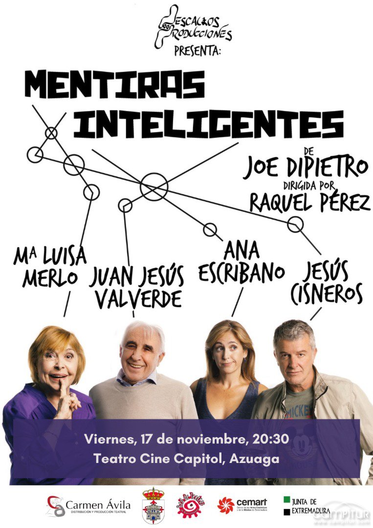 20:30 h. Representación de la obra de teatro “Mentiras Inteligentes”, con Mª Luísa Merlo, Juan Jesús Valverde, Ana Escribano y Jesús Cisneros. Venta anticipada de entradas en la Casa de la Cultura. Precio 5 €. Lugar: Teatro Cine Capitol.